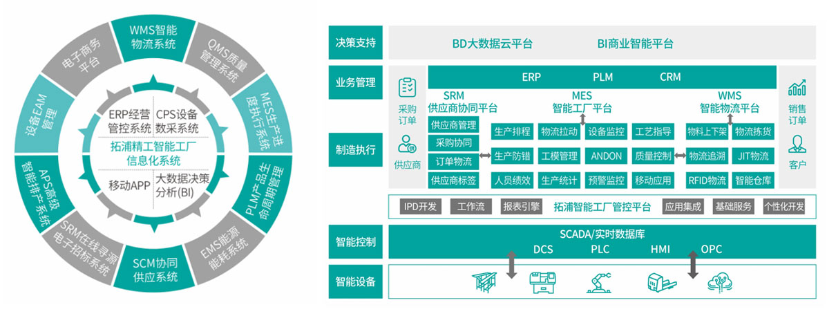 公司信息化系統(tǒng)包括:PLM、ERP、APS、MES、CPS、WMS、QMS、SCM、BI等14個模塊, 實現(xiàn)外部互聯(lián)(客戶、供應(yīng)商)、內(nèi)部互聯(lián)(人、機、料、法、環(huán)、測),使得經(jīng)營和生產(chǎn)全過程數(shù)據(jù)可采集、可分析、可追溯。